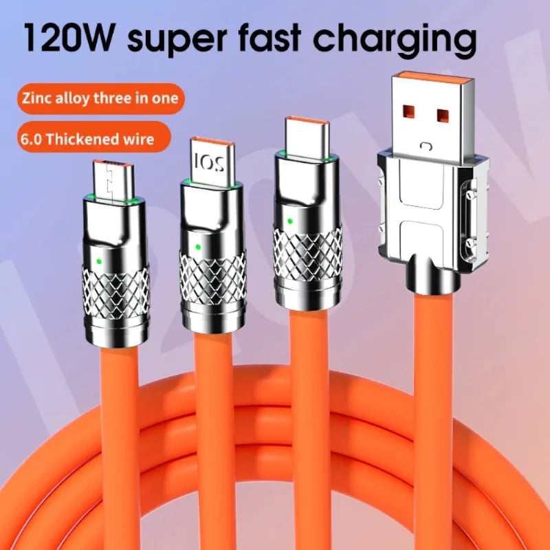 The Fast Charging Cable - 120W 3-in-1 Micro USB & Type C is designed for tech-savvy users who demand speed and versatility. This high-performance cable combines three charging options into one compact design, allowing you to power up your devices quickly and efficiently, no matter where you are.
